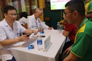 Đội ngũ y, bác sĩ thực hiện khám tổng quát và tư vấn sức khỏe cho người lao động.